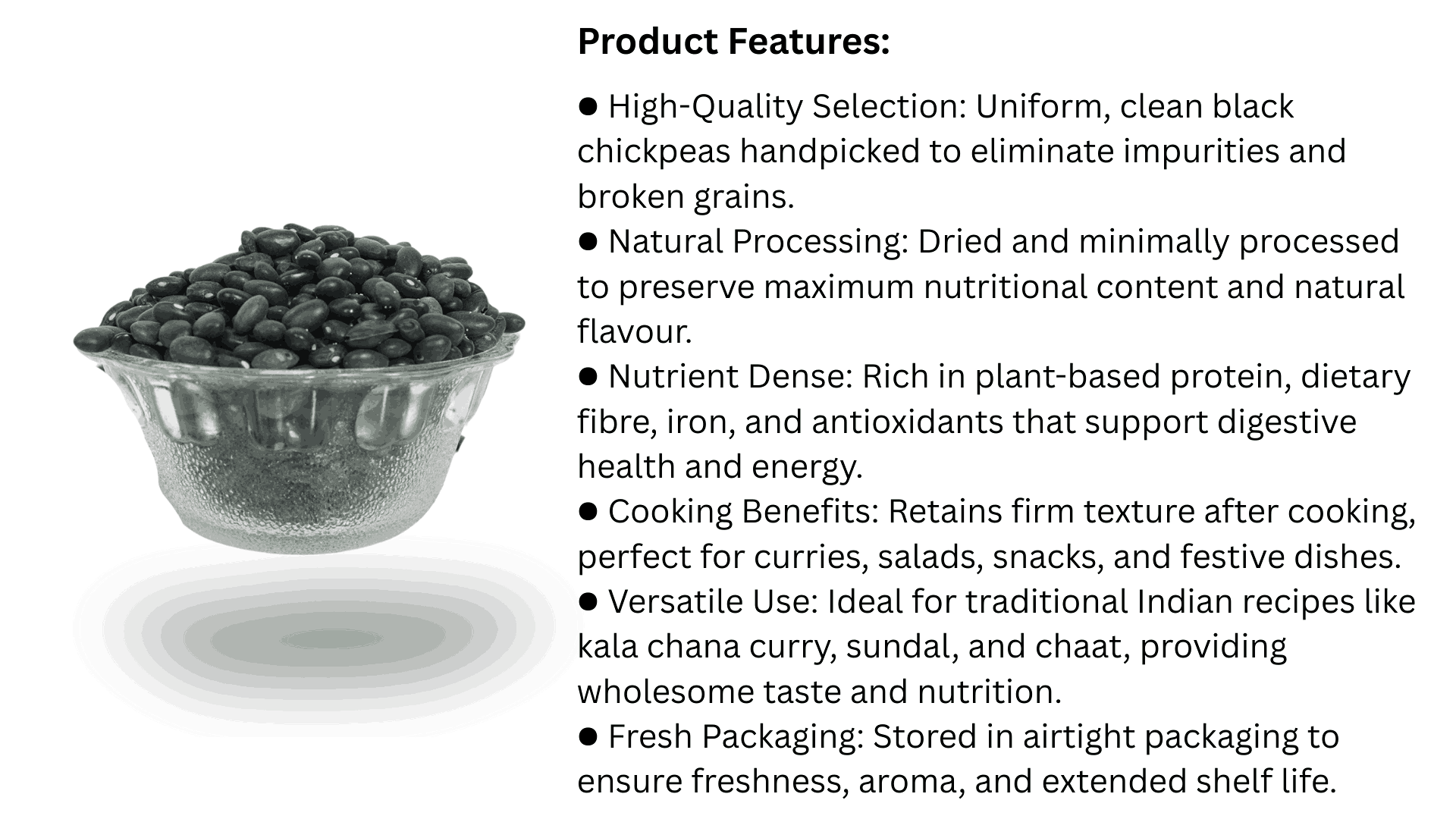 Compare| Brand Name: RAYA AGRO PRODUCTS (Product – (Black Kidney Beans) Kala Ghewda) Description: Raya Agro Products Kala Ghewda is premium-quality black chickpeas known for its rich texture and robust flavour. Carefully cleaned and naturally processed, it’s an excellent source of protein and fibre, perfect for nutritious everyday cooking. Product Features: Call to Action: |