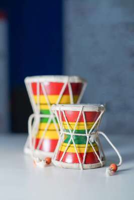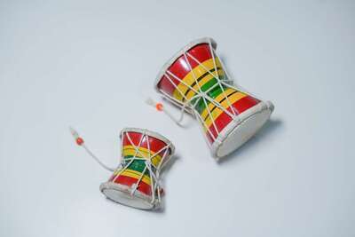 The Damaru is typically made of wood, and metal with leather drum heads at both ends. The Resonator is made of brass.
