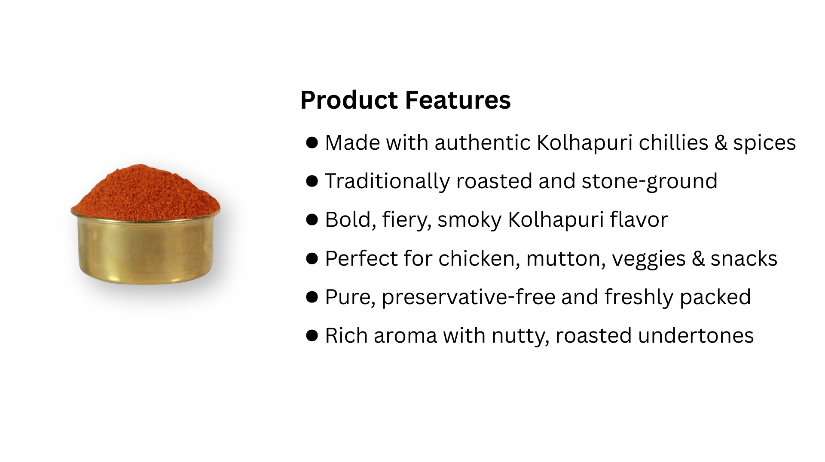 ● Bold & Fiery Flavor: Offers a smoky, nutty, and spicy profile characteristic of Kolhapuri cuisine.