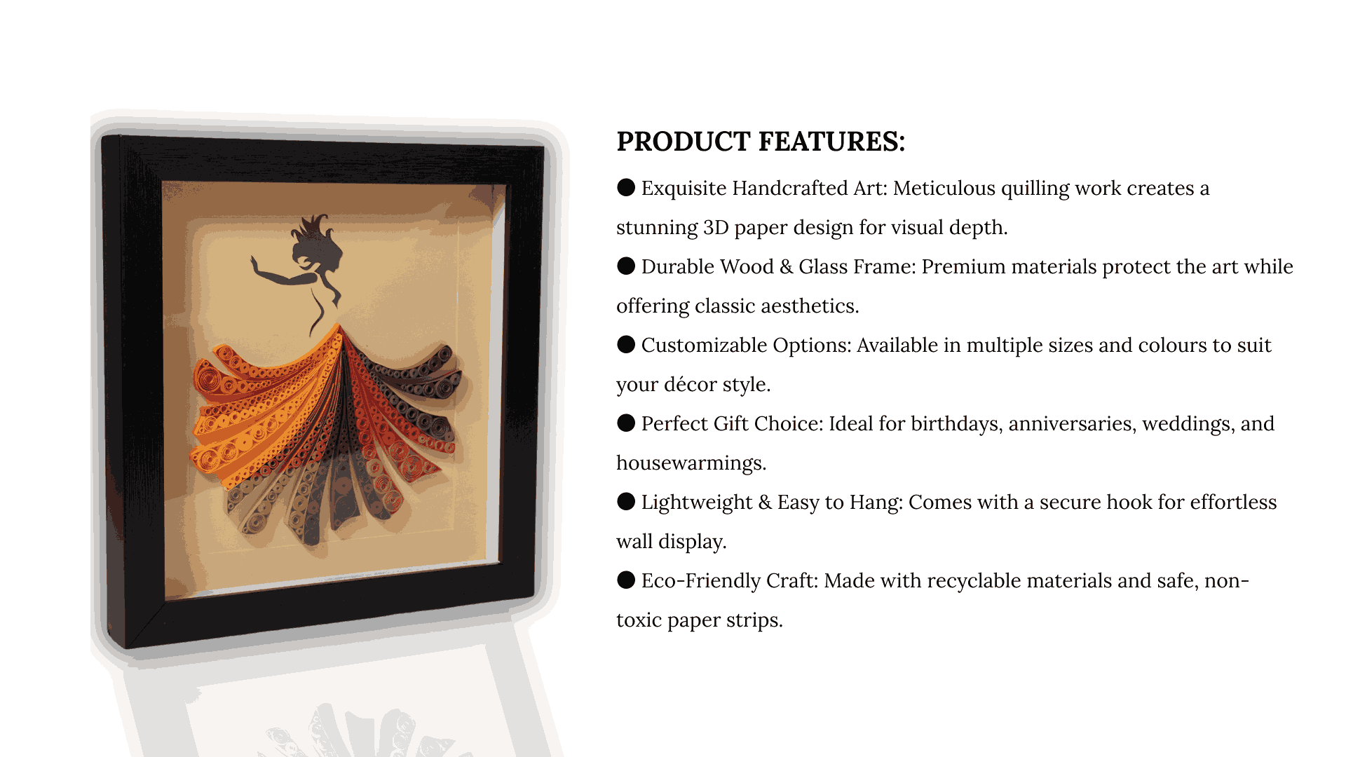 Compare| Brand Name: Qullish gift (Product – Quilling Frame) Description: Brighten your space with the unique charm of the Qullishgift Quilling Frame, featuring exquisitely handcrafted paper quilling art in a sturdy wood and glass frame. This intricate wall décor piece adds a delicate 3D floral effect, making it perfect for gifting or enhancing your home or office with handmade elegance. Product Features: Call to Action: |