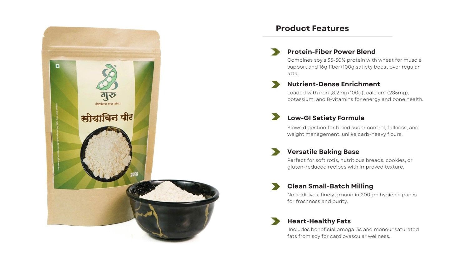 Guru Food Products’ Soyabean Wheat Flour (200gm) blends premium soy protein power with whole wheat for superior nutrition beyond plain wheat flour. This high-fiber, gluten-balanced mix boosts satiety, muscle health, and digestion in rotis, parathas, or baked goods – crafted for fitness-focused families seeking complete plant-based protein without compromise.